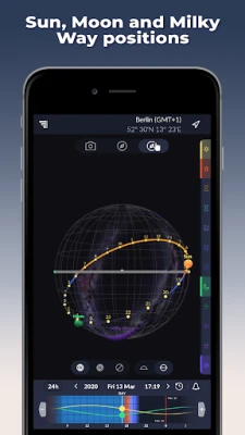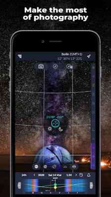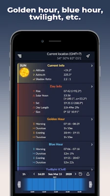 Aplikasi penting untuk jurugambar merancang gambar sempurna. Ramal kedudukan Matahari, Bulan, Bima Sakti, waktu emas, waktu biru, senja dan pelbagai momen istimewa lain untuk hasil foto yang menakjubkan.