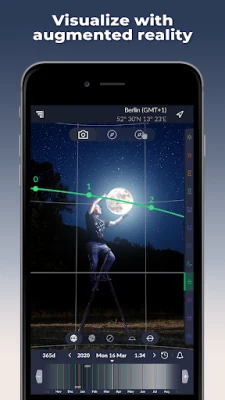 Manfaatkan teknologi canggih yang disertakan dalam Ephemeris – Sun and Moon Calendar & Calculator untuk memahami pergerakan objek langit dengan mendalam. Dengan ciri Kompas 3D, anda boleh menentukan kedudukan dan laluan tepat Matahari, Bulan, serta Bima Sakti di mana-mana lokasi dan pada bila-bila masa. Saksikan ramalan kejadian ini secara visual melalui Pandangan Langsung Realiti Bertambah (AR), membolehkan anda merancang komposisi foto anda dengan yakin sebelum tiba di lokasi. Untuk perancangan masa depan atau menganalisis masa lalu, gunakan Mesin Waktu untuk melihat kedudukan objek langit pada tarikh dan waktu pilihan anda, menjadikannya alat perancang yang tidak ternilai bagi jurugambar profesional mahupun amatur.