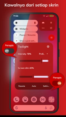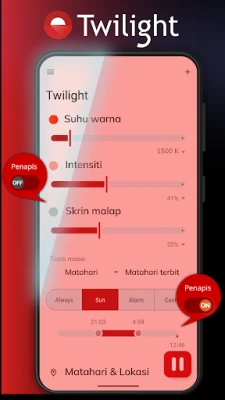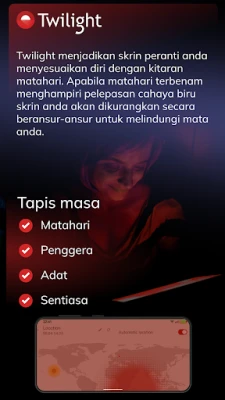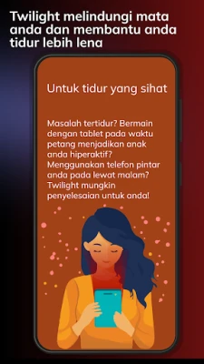 Dengan pendekatan yang berpaksikan sains, Twilight secara bijak menyesuaikan spektrum warna pada peranti anda sepanjang hari. Apabila matahari terbenam, ia secara automatik menapis gelombang cahaya biru yang mengganggu, menggantikannya dengan rona merah jingga yang lembut dan hangat. Intensiti penapis ini dilaraskan dengan lancar mengikut waktu senja tempatan anda, menciptakan suasana yang kondusif untuk relaksasi dan memudah cara proses tidur. Hasilnya? Ritma sirkadian anda kembali teratur, menjanjikan tidur yang lebih lena dan bangun dengan segar. Bukan itu sahaja, **Twilight** turut menawarkan mod bacaan malam yang memudarkan skrin di bawah kecerahan standard, sesuai untuk membaca tanpa mengganggu orang di sekeliling, serta dioptimumkan untuk skrin AMOLED bagi menjimatkan bateri dan melindungi daripada kesan "burn-in".