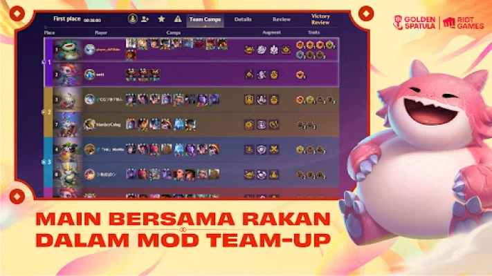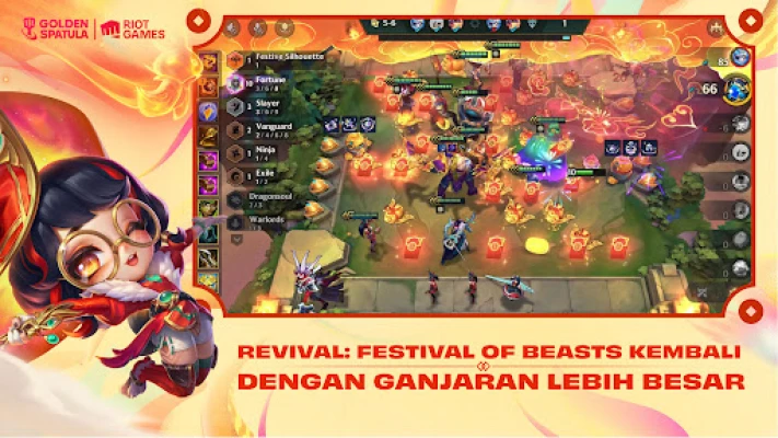 Tingkatkan keseronokan dengan mod Team-Up yang membolehkan anda bergabung tenaga bersama rakan. Bertarung bersama, naik pangkat serentak, dan kongsi setiap detik kemenangan atau kekalahan sebagai satu pasukan. Golden Spatula memastikan permainan yang adil dan positif tanpa perkongsian unit atau item, hanya semangat kerjasama murni. Jangan lepaskan peluang untuk menyertai Revival: Festival of Beasts yang kembali pada 5 Februari, membawa semula juara dan Trait kegemaran ramai. Sinergi Fortune kini memperkenalkan ciri Hujan Angpau, menjanjikan kejutan dan ganjaran berlimpah. Kumpul syiling penebusan untuk membuka Little Legends dan Boom eksklusif secara percuma. Anda juga boleh membuka 16 juara Lunar Revel yang istimewa, mereka ini akan menyertai pertempuran tanpa mengambil slot pasukan utama, membuka ruang untuk susunan strategi yang lebih kreatif.