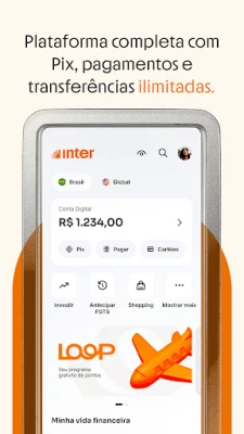 Inter melangkah lebih jauh dengan menawarkan akaun antarabangsa dalam dolar, membolehkan anda merasai gaya hidup global tanpa yuran pembukaan atau penyelenggaraan. Kami juga prihatin terhadap masa depan generasi muda dengan menyediakan akaun digital percuma untuk bawah 18 tahun: Conta Kids untuk perancangan dan pelaburan masa depan anak-anak anda, dan Inter You untuk remaja belajar mengurus kewangan sendiri. Manfaatkan sepenuhnya pengalaman anda dengan program Inter Loop untuk menukar mata ganjaran dengan pelbagai faedah seperti diskaun bil, pulangan tunai tambahan, atau pelaburan. Temui kemudahan membeli-belah dengan diskaun eksklusif dan pulangan tunai di kedai-kedai terbaik, dapatkan penyelesaian pinjaman yang sesuai, atau pilih perlindungan insurans melalui Platform Perlindungan Inter. Dengan Inter, anda tidak perlu lagi bertukar aplikasi – nikmati perbankan, broker, perancangan belanjawan (Bússola), perancangan perjalanan (Inter Viagens) dan banyak lagi, semuanya dalam satu Aplikasi Super yang berkuasa.