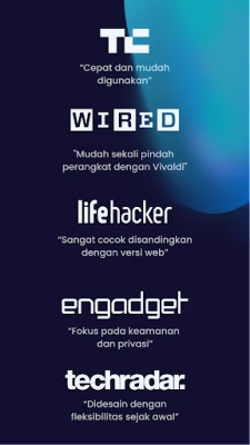 Alami pelayaran web yang benar-benar peribadi dan disesuaikan dengan Vivaldi, pelayar yang direka untuk anda. Kami percaya privasi anda adalah hak, bukan keistimewaan. Dengan Vivaldi, jejak digital anda kekal milik anda. Tiada penjejakan aktiviti, tiada data yang disimpan daripada tab peribadi anda; segala-galanya daripada sejarah carian hingga fail sementara akan lenyap sebaik sahaja anda menutupnya. Ini adalah janji untuk kebebasan digital yang sebenar, membolehkan anda mengawal sepenuhnya pengalaman dalam talian anda.